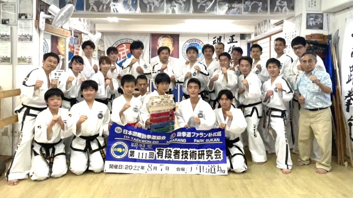 有段者技術研究会 第111回有段者技術研究会 2022年8月7日 ファラン朴武館 2022年8月6日、戸田道場にて第111回有段者技術研究会が開催されました。 目次概要稽古風景稽古後概要 日時2022年8月6日場所戸田道場指導朴禎賢師賢、朴禎祐師範、梅田達哉師範参加者30名 稽古風景 朴禎祐師範による拳足鍛錬の稽古 有段者向けの約束組手の稽古 稽古後 稽古後に先日行われた全日本ジュニアに出場した選手に記念品が贈呈されました。 最優秀選手賞を受賞した稲垣空雅1段(川崎道場)