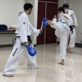 手の動作ではミットに当てることで感覚を養うように、チャギ(蹴り)ではマッソギ(組手)を意識した稽古を行いました。