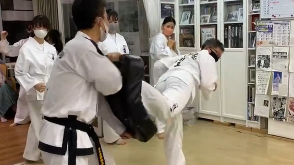 回転して蹴りをするトルミョ・ヨプチャチルギの稽古風景です。