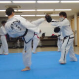 パンデトルリョチャギ(後ろ回し蹴り)、ネリチャギ(踵落とし)、ティミョパンデトルリョチャギ(飛んで後ろ回し蹴り)、ティミョネリチャギ(飛んで踵落とし)などを練習しました。