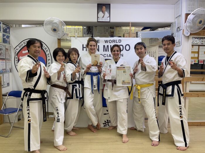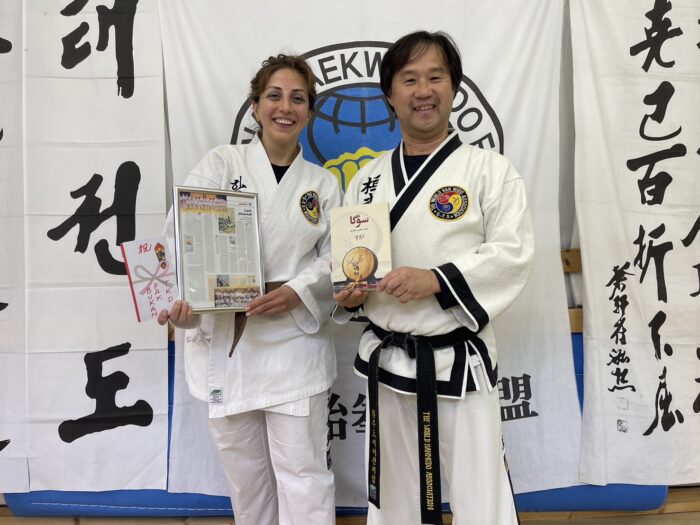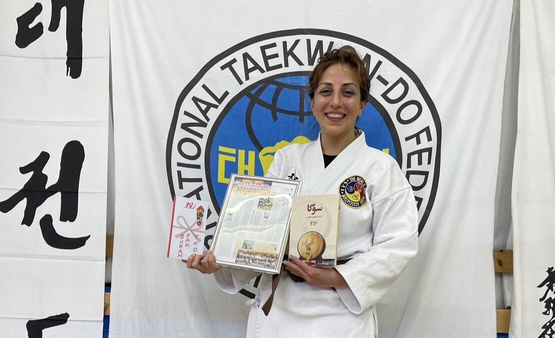 色彩兼備のファルナズさんは、2021年コロナ禍が脅威を奮う最中、テコンドー朴武館 戸田道場に入門しました。入会当初より熱心に跆拳道を学び、戸田、上尾道場など週に3〜4回の稽古を積み重ね、短期間で1段に昇段し、正統跆拳道の有段者となりました。