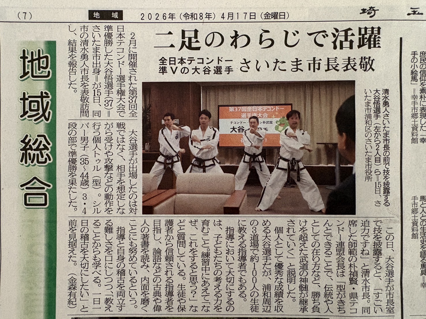 お知らせ メディア関係 埼玉新聞に清水勇人さいたま市長 表敬訪問の様子が掲載されました 2026年4月17日 ファラン朴武館 2026年4月17日付の埼玉新聞に清水勇人さいたま市長 表敬訪問の様子が掲載されました。掲載にあたり、ご尽力いただいた埼玉新聞の関係者の方へ感謝申し上げます。