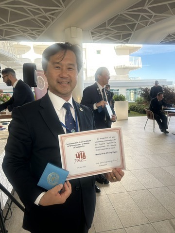 各国グランドマスター達、ITF国際委員マスター達が表彰される中、ITF世界大会競技委員として多少の貢献が出来た小生にも、僭越ながら「功労賞」を授与頂きました。
