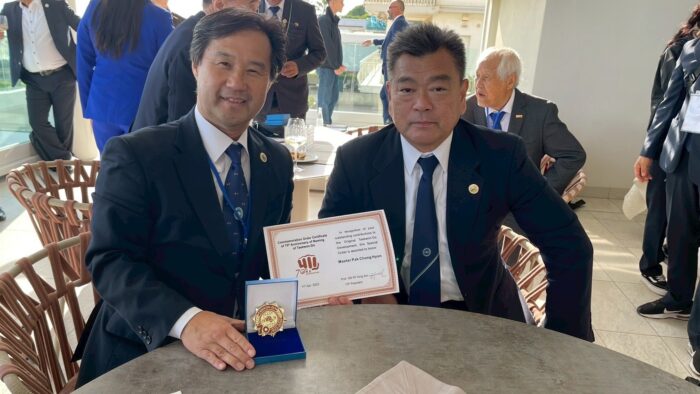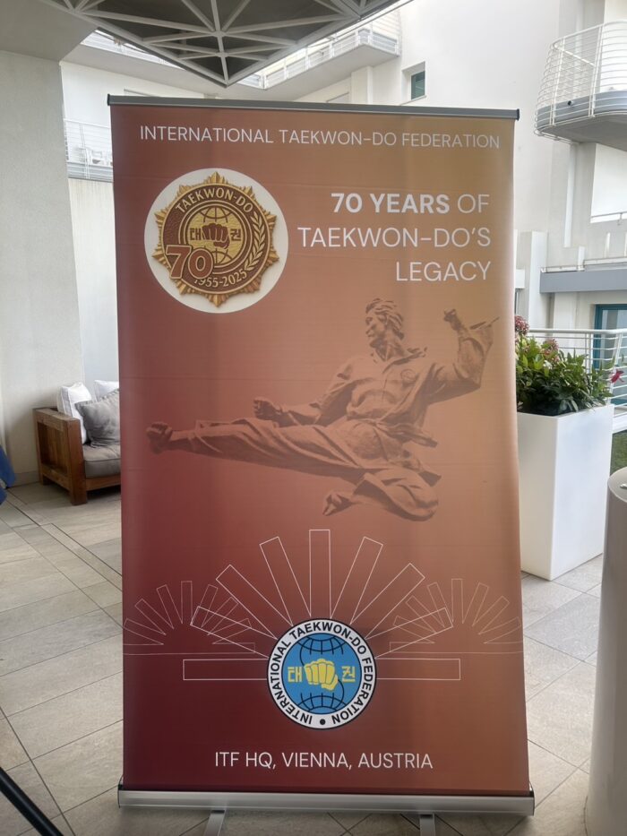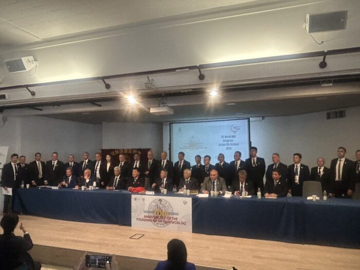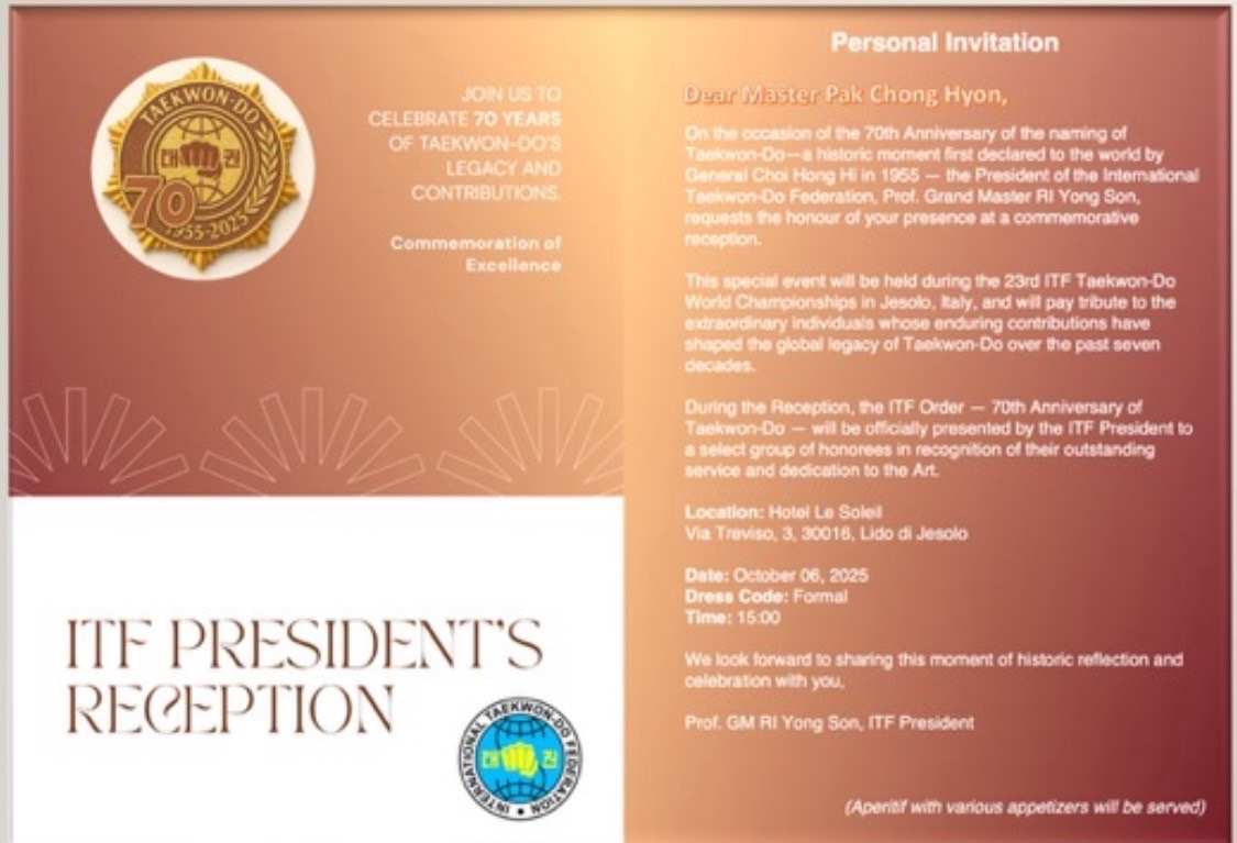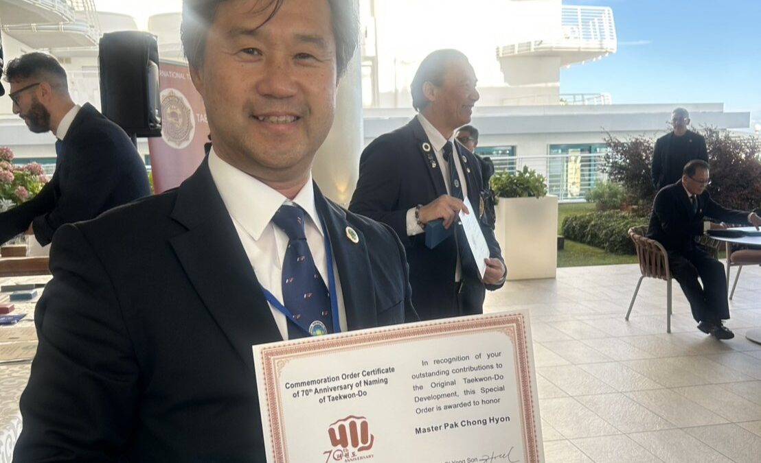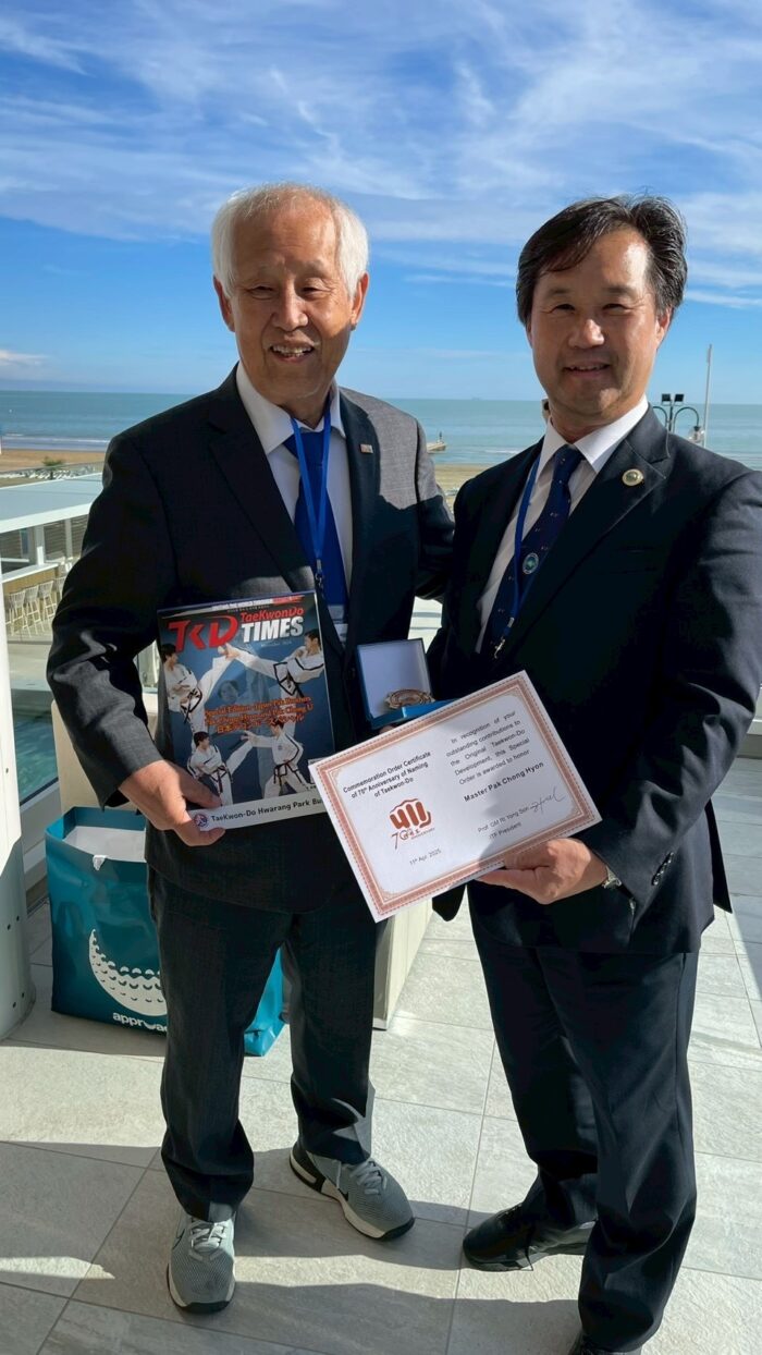 世界大会 【第23回世界大会競技】朴禎賢師賢 ITFテコンドー70周年記念式典で功労賞を受賞 2025年10月6日 ファラン朴武館 2025年10月6日、イタリア・イェーゾロで開かれたITFテコンドー総会にて、朴禎賢師賢が功労賞を受賞しました。 日本国際テコンドー協会 磯村創会長と記念撮影 同じく功労賞を受賞されたテコンドータイムズのチョンウジン会長と ITF総会の様子 70周年記念式典 アドリア海をバックにヨプチャチルギ